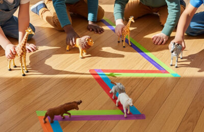 Amb una mica de cinta de colors pots fer camins al terra perquè els infants hi juguin amb cotxes, animals o caminant com si fos una aventura!