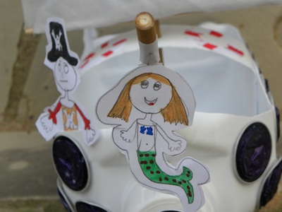 També podem fer un bon vaixell pirata! I només ens cal una ampolla de plàstic i paper. Quan tinguem una ampolla buida, preferiblement de llet, ja que així tindrà millor forma, dibuixem un cercle a la part superior. Després, retallem amb l’ajuda d’un cúter. Una vegada ho tinguem, ja ho podem decorar! Dibuixem els pirates, sirenes, la bandera pirata, i hi fiquem gomets de tots els colors.