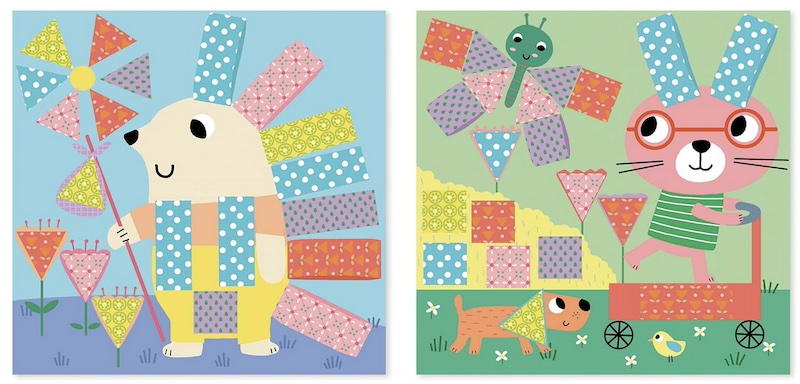 Aquest kit inclou 4 quadres d’animals (cocodril, ocell, conill i eriçó) que els nens han de completar retallant i enganxant trossets de paper estampat seguint les formes marcades.
