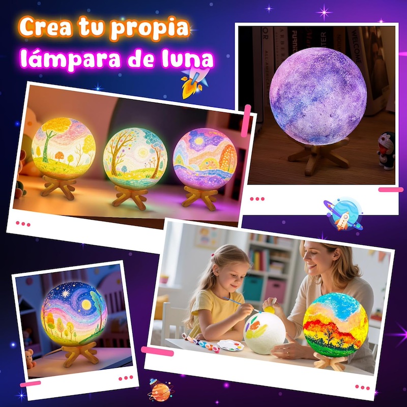 Aquest kit permet als infants pintar i decorar una lluna 3D, que després es converteix en una llum nocturna. Inclou tot el necessari: làmpada de lluna, suport, pintures, esponges, pinzells, paleta, comandament a distància i cable de càrrega, a més d’un manual d’instruccions.