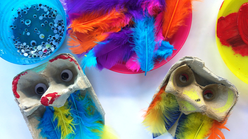 ¡También podemos utilizar el cartón y el envase de los huevos! Aprovechamos sus huecos para pegar plumas de todos los colores que encontremos. Y dos de los huecos también pueden ser los ojos de los búhos.