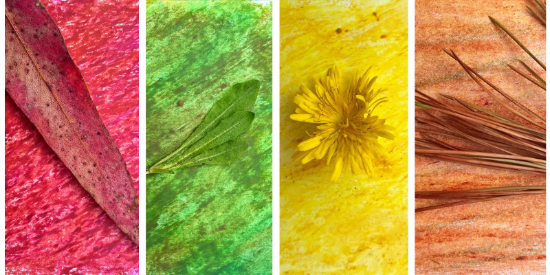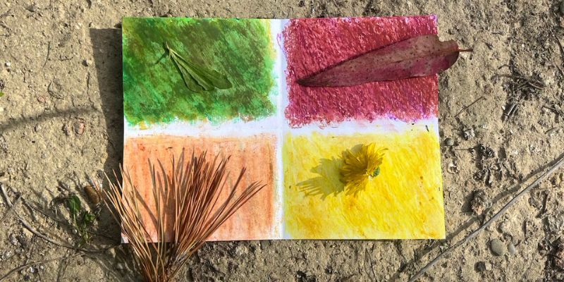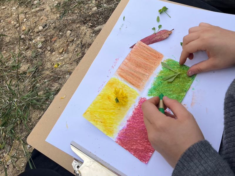 Se trata de una actividad que podemos hacer en familia, en el parque, en el bosque o en el jardín. Consiste en recoger pequeños elementos naturales —como flores, hojas o ramitas— e intentar reproducir su color con ceras sobre papel.