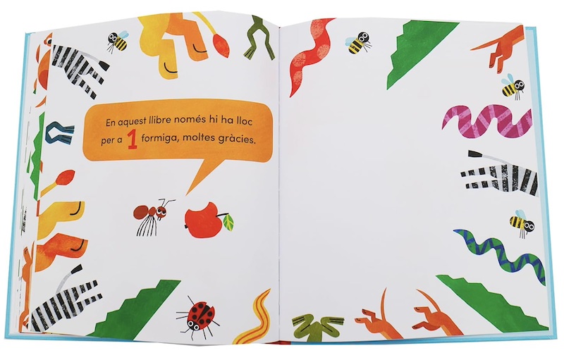 La formiga ha estat molt sincera. La formiga ho ha deixat ben clar. Aquest llibre és perfecte per a una formiga. Només hi ha lloc per a una formiga? Segur que no. Hi ha d’haver espai per a algú més! Per a dos lleons, potser? I probablement també hi ha lloc per a tres cocodrils… I qui més? Però quants animals hi caben, en aquest llibre?